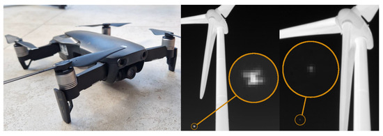 Image points and are detected by the image-processing methods background subtraction, thresholding, morphological operations (erosion and dilation) and blob analysis with the Python module scikit-image 0.19.1 [47]. The background subtraction extracts regions with movement (column 3 in Figure 8) by building up a background image consisting of the median pixels of past images, followed by thresholding. The result are regions which become modified by the morphological operations and labeled to find distinct candidates for further 2D processing (more details can be found in Appendix E). Each candidate consists of an inner part and a border (column 4) and can be analyzed by blob analysis, deciding whether to keep or dismiss them by thresholding for their median intensity, intensity differences (between inner region and border), sizes, eccentricity and other parameters. The intensity difference between the inner region and the border helps reduce false positives, such as those caused by partially detected rotor blades. The final 2D point coordinates are defined by their intensity-weighted centers of gravity. The exact thresholding parameters are found experimentally and depend on the used thermal cameras (image format, resolution, bit depth and the NETD (Noise Equivalent Temperature Difference)) and the weather (clouds, temperature and humidity). The attached code [43] provides a 3D-calibration example, including the complete 2D detection with all adjustable 2D measures and parameters.