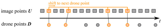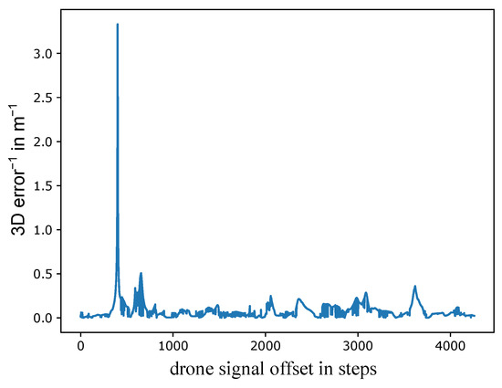 To be able to correspond the 2D image points and and the 3D UAV points from Section 3.2, it is indispensable to time-synchronize the UAV and the camera signals. If the GPS signal of the UAV and the camera signals are assumed to have correct relative timestamps, the problem is reduced to finding the offset between them. This can be achieved by assuming that successful synchronization allows for a meaningful calibration, marked by small errors. Thus, the signals are shifted relative to each other (Figure 6), and the 3D calibration error is repeatedly evaluated to find the minimum: