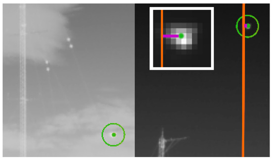 After performing the 2D image point detection separately for both cameras, the next step is to find the correspondences between points in both cameras. Based on the preliminary calibration, epipolar geometry is used to find the correspondences. This is based on the idea that for a known 3D calibration, points in one camera map to lines in the second camera as [48] suggested. This can be seen in Figure 9. A point in the image plane of the first camera maps to a line in the image plane of the second camera because of the already known epipolar geometry based on the 3D calibration. Therefore, this line has to be searched for the corresponding object. Because the 3D calibration as well as the object detection algorithms are not exact, a threshold defines the allowed distance to this line (illustrated in pink). Figure 10 shows one example of how this principle is used on our image data to find the corresponding drone points.