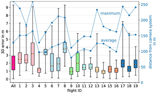 Following the methodology, we carried out 19 independent flights at two different locations, with 6 different camera setups. For each setup, we performed a minimum of two UAV flights in order to use one flight at a time for reconstruction/evaluation and the others for 3D calibration. All flights were performed manually and independently of one another. Each time we sought to cover significant parts of the measurement volume. The flights lasted between 3.9 and 12.6 min with an average of 7.7 min. The mean UAV distance from the camera system over all flights was 122 m, with individual values ranging from 33 m to 260 m. The 19 UAV flights lead to 19 3D error boxplots by cross-validation, reflecting the 3D-calibration quality (Figure 11).