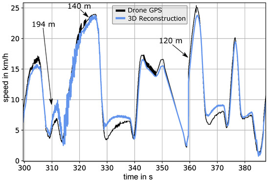 The median 3D errors per flight are between 0.92 m and 3.78 m, with a median of 1.78 m over all calibration flights. In order to see if this accuracy is sufficient for calculating a speed curve, we plotted a comparison between the UAV GPS and the 3D reconstruction in Figure 13.