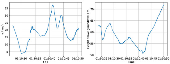Speed (left) and height above ground curve (right) of the flight track in Figure 15.