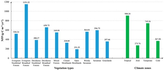 Additionally, the NPP exhibited significant variations over different vegetation types and climate zones (Figure 2). Specifically, evergreen broadleaf forests showed the highest NPP (1151.32 g C m−2 yr−1), followed by deciduous broadleaf forests (658.75 g C m−2 yr−1), savannas (596.79 g C m−2 yr−1), and woody savannas (564.01 g C m−2 yr−1). Conversely, open shrublands had relatively lower NPP (191.39 g C m−2 yr−1). At the scale of climatic zones, the tropical climate zone exhibited the highest NPP (908.20 g C m−2 yr−1), followed by the temperate climate zone (745.26 g C m−2 yr−1) and the cold climate zone (367.50 g C m−2 yr−1). However, the arid climate zone had the lowest NPP (273.76 g C m−2 yr−1).