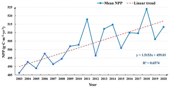 During 2003–2020, the multi-year average of the global vegetation NPP was 503.43 g C m−2 yr−1, showing a fluctuating upward trend of 1.52 g C m−2 yr−1. The regions with a significant increase in NPP (9.22 g C m−2 yr−1) were mainly concentrated in Central Africa, while regions with a decrease in NPP (−3.21 g C m−2 yr−1) were primarily observed in the Amazon Rainforest in northern South America.