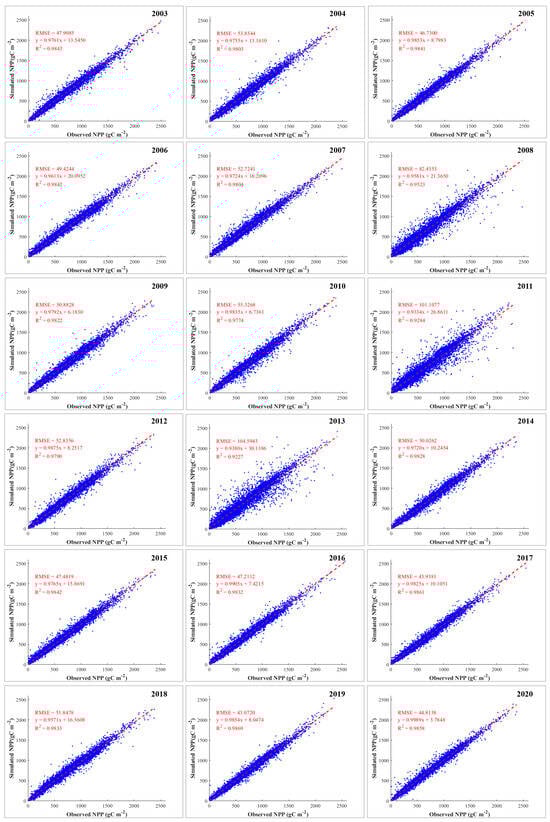 A scatterplot of the observed and simulated NPP values from 2003 to 2020.