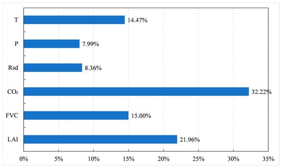 From the perspective of each factor’s contribution to NPP, CO2 (relative contribution of 32.22%) had the greatest impact on the global vegetation NPP variation, followed by the LAI (21.96%), FVC (15.00%), and temperature (14.47%). However, the contributions of Rsd and precipitation were relatively low (<10%).