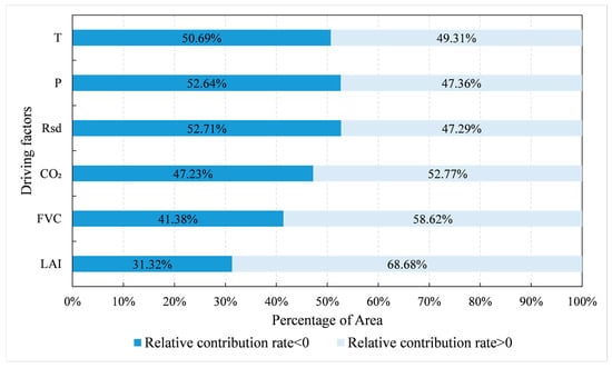 Figure 7 shows the mean absolute values of the relative contributions of each driving factor to the global vegetation NPP variation. The results indicate that CO2 had the greatest impact on the global vegetation NPP variation, with a mean absolute relative contribution rate of 32.22%, followed by the LAI (21.96%), FVC (15.00%), and temperature (14.47%). In contrast, the contributions of Rsd and precipitation were relatively low (<10%). With respect to the sign of the contribution, the LAI, FVC, and CO2 primarily exhibited positive contributions to NPP change, with their respective areas accounting for approximately 68.68%, 58.62%, and 52.77% of the total area. However, Rsd (−52.71%) and precipitation (−52.64%) mainly showed negative contributions (Figure 8). Spatially, the contribution of the LAI was relatively high in mid- to high-latitude regions. On the other hand, CO2 generally had a relatively high contribution in Central Africa and South America. Meanwhile, the contribution of the temperature was higher in high-latitude regions, with a lower contribution mainly in tropical areas (Figure 9).
