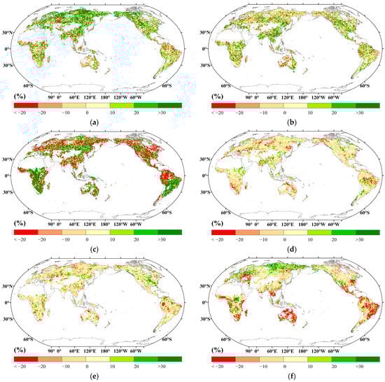 Previous studies have revealed that, since the beginning of the twenty-first century, there have been significant changes in the global vegetation and climate [,,,]. In addition, the coverage of the available datasets listed above started in 2003. Therefore, we extracted all data spanning 2003 to 2020 for our evaluation. To ensure uniformity in the spatial resolution, each dataset was resampled to 1° before conducting an annual proportional analysis.