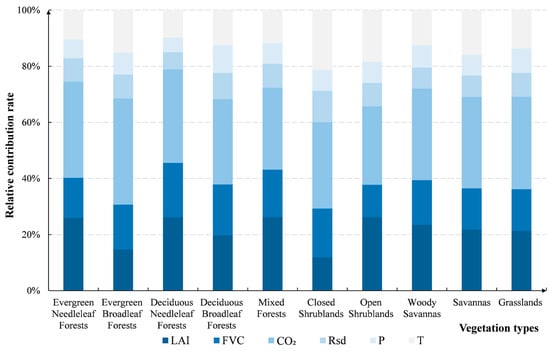 The mean absolute values of the relative contributions of the driving factors to NPP variation across different vegetation types.