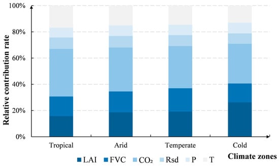 This study further explored the contributions over different vegetation types and climate zones. As shown in Figure 10, the CO2, LAI, FVC, and temperature factors had the predominant impacts on most vegetation types. Specifically, CO2, the LAI, and the FVC acted as the key contributors in evergreen needleleaf forests (contributing 34.25%, 25.96%, and 14.28% to the total change, respectively) and deciduous needleleaf forests (33.34%, 26.15%, and 19.37%). In evergreen and deciduous broadleaf forests, CO2 (37.79%, 30.40%) had significant effects. At the same time, CO2 and the temperature were the key factors in closed shrublands, with contribution rates of 30.78% and 21.30%, respectively. However, both Rsd and precipitation exhibited limited contributions to NPP change (<10%). Figure 11 presents the impacts of the different factors over different climate zones. In tropical regions, CO2 exhibited the greatest contribution (36.29%), followed by the temperature (16.83%), LAI (15.73%), and FVC (14.94%). In contrast, Rsd and precipitation had limited effects on vegetation NPP variation, with contributions of 8.73% and 7.48%, respectively. In addition, as the climate transitioned from arid zones to temperate and cold regions, the combined contribution of the LAI and FVC to the NPP gradually exceeded the contribution of CO2.