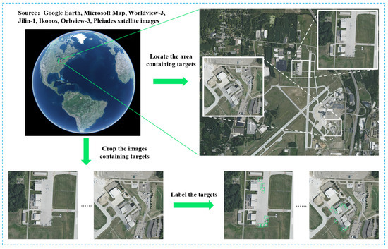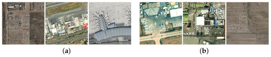 In recent years, with the continuous progress of computer vision, deep learning models that possess powerful feature extraction and feature representation capabilities have become popular solutions in the field of object detection [8,9]. However, deep learning requires a large amount of high-quality data for training, and the performance of various deep learning-based algorithms largely depends on the quality and quantity of data. In order to promote the rapid development of the aircraft detection models, many researchers have published a series of research datasets in the field of optical remote sensing. In 2014, the NWPU VHR-10 remote sensing dataset [10] was published by Northwestern Polytechnical University, which contains 10 types of typical targets including aircraft and ships, with a total of 757 aircraft instances. In 2015, the University of Chinese Academy of Sciences released the UCAS-AOD dataset [11], which consists of 800 very-high-resolution (VHR) remote sensing images obtained from Google Earth and the Vaihingen dataset. The dataset covers two types of targets and the images, containing 7482 aircraft instances, are all extracted from the Google Earth platform. Two years after this time, the RSOD dataset [12] was released by Wuhan University and comprises four types of targets including aircraft, oil tanks, overpasses and playgrounds. The number of aircraft instances reaches 4993, and the data are derived from Google Earth and Tianditu. In 2017, the LEVIR dataset [13] was provided by Beihang University, whose images are sourced from Google Earth. The LEVIR comprises three types of targets including aircraft, ships and oil tanks, with a total of 4724 aircraft instances included. In 2018, the DOTA dataset [14] was published by Wuhan University, comprising 14 categories including aircraft and ships, with a total of 14,085 aircraft instances. The data were obtained from Google Earth, Jilin-1, and Gaofen-2. In the same year, the TGRS-HRRSD dataset [15] was provided by the University of Chinese Academy of Sciences. The images were obtained from Google Earth and Baidu Map, and the spatial resolution is between 0.15 m and 1.2 m. The dataset contains 13 classes and 4899 aircraft instances. In 2020, the DIOR dataset [16] was constructed by Northwestern Polytechnical University. The images were extracted from Google Earth, and contain 20 categories including aircraft and ships, with 10104 aircraft instances. In addition, IQT-CosmiQ Works released an open-source dataset, RarePlanes [17], which comprises of 253 Worldview-3 remote sensing images and 50,000 synthetic images, containing 14,707 real aircraft instances and 629,551 synthetic aircraft instances. In 2022, the HRPlanes dataset [18] was proposed by Yildiz Technical University. The image scenes were extracted from Google Earth’s large airports such as the Paris Charles de Gaulle and Amsterdam airports, providing 18,477 aircraft target instances.