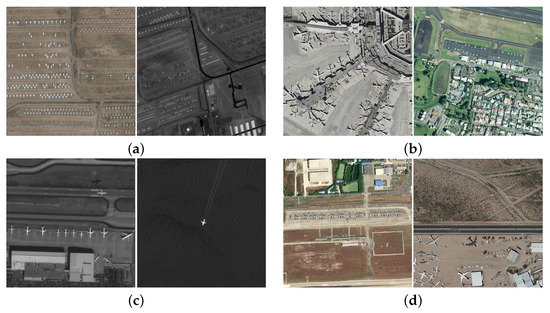 Figure 3. Examples under different detection conditions. (a) Different platforms. (b) Different airports. (c) Different target states. (d) Different target types.