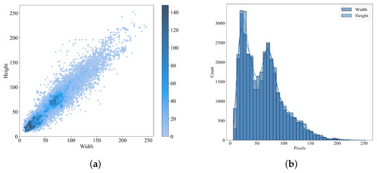 Figure 5. Scale distribution of aircraft in the dataset. (a) Height and width distribution. (b) Area distribution.