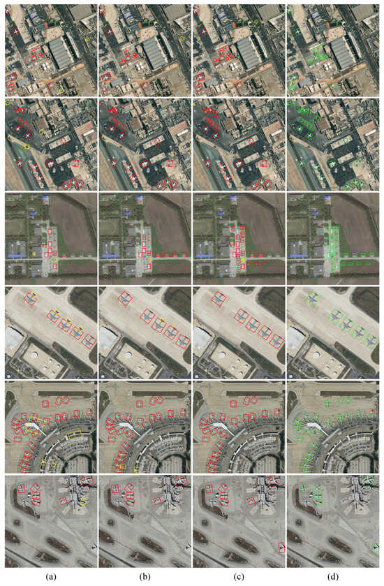 Figure 8. Experimental results of typical advanced detection methods: (a) Rotated faster R-CNN, (b) S 2 A-Net, (c) Oriented RepPoints, and (d) ground truth. It should be noted that green represents ground truth, red represents algorithm prediction results, and yellow represents error detection.