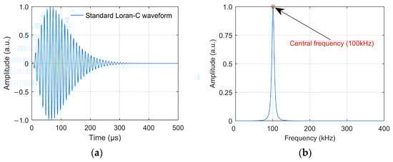 where A is a constant related to the peak amplitude; t is the time in μs; τ is the envelope-to-cycle difference in µs; = 100 kHz is the carrier frequency, and = 0 or π is the phase code parameter, in radians. According to the above definition, Figure 1 shows the standard Loran C pulse waveform and the normalized amplitude spectrum.