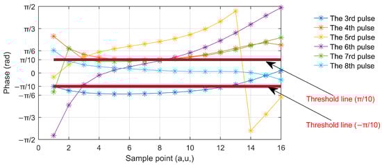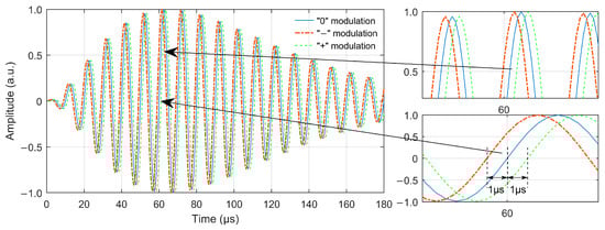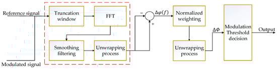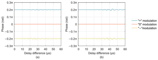 Following this, the algorithm uses multi-threshold processing, set at ±18°, to ascertain the polarity of the phase difference. Phase differences within the −18°~18° range are deemed “0” modulation; those surpassing 18° are labeled as “+” modulation; and those falling below −18° are recognized as “−” modulation. Ultimately, based on the statistical outcomes from N sampling points, the modulation state is determined by a majority decision, with error correction applied according to the principle of balanced modulation when an equal number of modulation states occur [,].