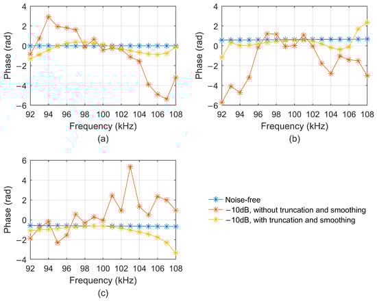Figure 6 depict the phase difference vector curves for three different modulations. It is evident that these curves, post-truncation window sampling and spectral smoothing filtering, exhibit remarkable smoothness, closely resembling noise-free conditions, effectively reducing the risk of phase jumps. In contrast, without truncation and smoothing, the phase fluctuates dramatically. In Figure 6b,c, the weighted phase differences are calculated as 0.0485π and 0.2871π, respectively, which are within the wrong threshold range, leading to incorrect modulation decisions of “0” and “+”.