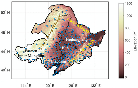Study area of Northeast China (NEC) including Heilongjiang, Jilin, and Liaoning Provinces and the eastern region of Inner Mongolia. The blue dots represent the gauge precipitation measurements.