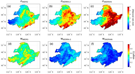 Error standard deviation of daily precipitation estimates in (a) IMERG, (b) MERRA-2, and (c) SM2RAIN and corresponding weights assigned to each data set as shown in (d–f) by using IMERG as the reference data. The white area indicates that the calculated error variance is negative or water bodies where SM2RAIN data are missing.