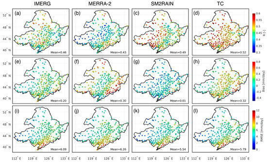 The statistical skill R ((a–d) the top row), bias ((e–h) the middle row), and RMSE ((i–l) the bottom row) of IMERG ((a,e,i) the first column), MERRA-2 ((b,f,j) the second column), SM2RAIN ((c,g,k) the third column), and the merged (i.e., TC, (d,h,l) the last column) products when evaluated against ground-based stations.