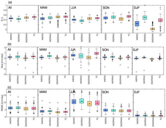 Boxplots of the statistical metrics for the study period and different seasons, including (a) R, (b) bias, and (c) RMSE, at all examined ground-based stations. Note that the circle and triangle symbol represent outlier and mean value, respectively.