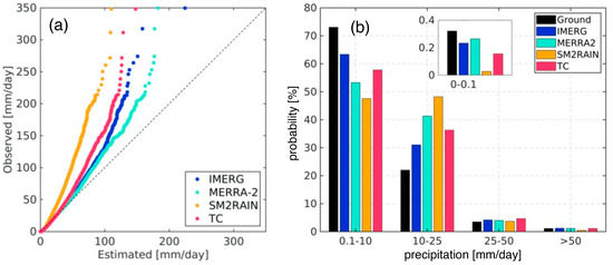 (a) The quantile–quantile plot of the estimated daily precipitation from IMERG, MERRA-2, SM2RAIN, and TC against the observed precipitation from ground-based stations. (b) The probability distribution of daily precipitation intensities from estimated and observed data sets.
