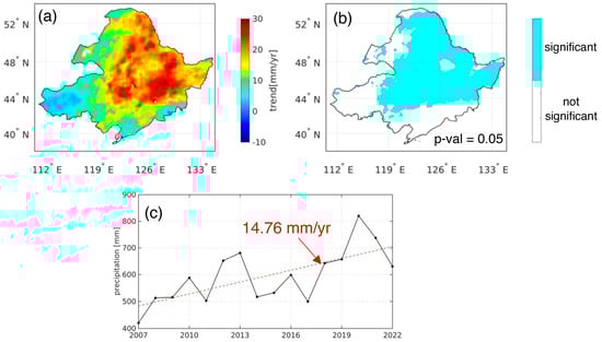 (a) Trend of annual cumulative precipitation from 2007 to 2022 in NEC; (b) statistical test result for the trend significance; and (c) time series of region-averaged annual cumulative precipitation with a linear trend fitted.