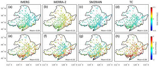 Bias from IMERG, MERRA−2, SM2RAIN, and TC daily precipitation estimates at all examined ground-based stations in (a–d) January and (e–h) August. Empty circles in (c,d) are due to the unavailability of SM2RAIN data.