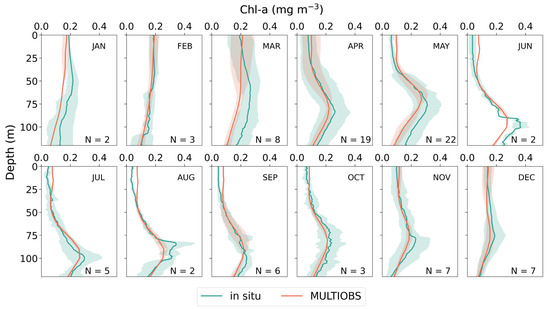 Monthly averaged vertical chlorophyll-a concentration (Chl-a) profiles obtained from in situ data over the Eastern Mediterranean Sea and the corresponding matched (in space and time) monthly averaged vertical profiles obtained from the MULTIOBS product. N denotes the number of matched profiles per month.