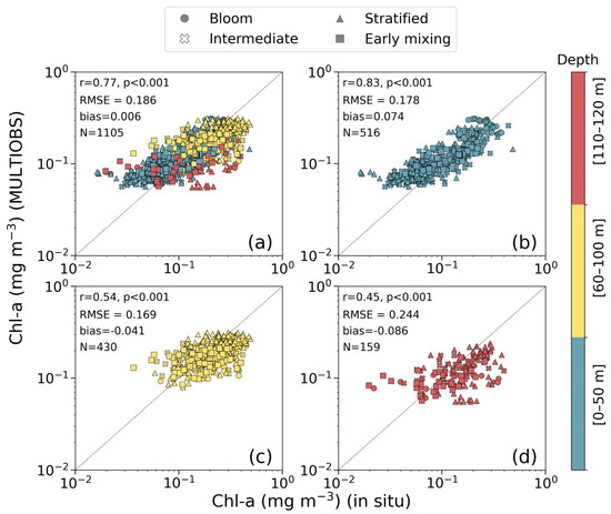 Scatterplots of the matchups between in situ- and MULTIOBS-derived chlorophyll-a concentration (Chl-a) over the Eastern Mediterranean Sea, with colours indicating the different depth layers. (a) Overall relationship across all depths within the 0–120 m layer, (b) surface layer scatterplot considering matchups within 0 to 50 m of depth, (c) intermediate layer scatterplot considering matchups within 60 to 100 m of depth, and (d) deeper layer relationship considering matchups within 110 to 120 m of depth. For clarity, only values at every 10 m interval within the 0–120 m depth layer are plotted. Different symbols represent distinct time periods: bloom [circle]—January–March; intermediate [× symbol]—April; stratified [triangle]—May–September; and early mixing [square]—October–December. The 1:1 line is shown as a black dotted line. Statistical metrics for MULTIOBS performance are provided in each panel (see Section 2 for abbreviations of metrics).