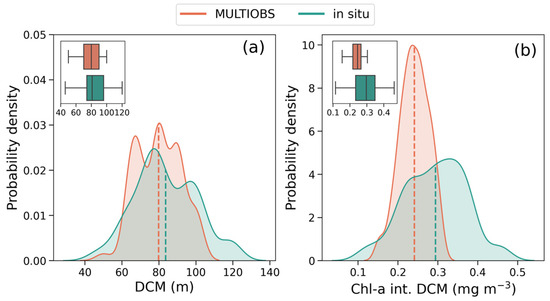 Distribution of in situ and MULTIOBS data derived for the Eastern Mediterranean Sea, showing (a) the position of deep chlorophyll maximum (DCM) and (b) the chlorophyll-a concentration (Chl-a) at the DCM, calculated as the mean integral of a 20 m layer centred at the DCM. Data are presented using kernel density estimation plots with boxplots shown as insets. Only matched-up profiles characterised as DCM type are analysed. Dashed line represents the mean of each distribution.
