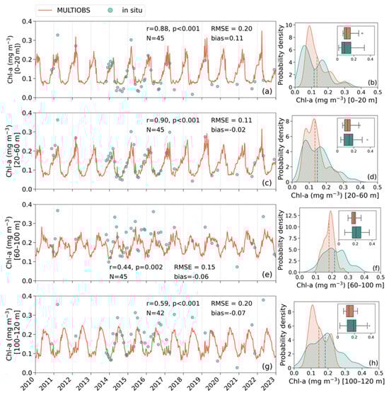 An excellent agreement between in situ and MULTIOBS data is observed within the upper (0–20 and 20–60 m) layers of the water column (Figure 5a–d). For example, in situ data show that the annual maxima of 2012, 2015, 2017, and 2019 were substantially higher than the annual maxima of 2014 and 2016, a pattern that is reproduced by the MULTIOBS both qualitatively as well as quantitatively. The correlation between the matchups of in situ and MULTIOBS data points in the 0–20 and 20–60 m depth layers is very strong and significant (r ≥ 0.88, p < 0.001) (Figure 5a,c), and the distributions of the matched in situ and MULTIOBS data at the E1-M3A site are quite similar in terms of the range of values and mostly overlap (Figure 5b,d). However, the RMSE suggests an almost 1.6- and 1.3-fold deviation, on average, between MULTIOBS and in situ data within the 0–20 m and 20–60 m depth layers, respectively. There is a slight overestimation by the MULTIOBS product within the upper surface layer (0–20 m) at the level of 29% (Figure 5a). Conversely, the product has an excellent performance in terms of accuracy within the 20–60 m layer, as shown by the minuscule bias (5% underestimation) estimated for this layer (Figure 5c). The comparison of climatologies computed for the MULTIOBS and in situ data reveals that within the surface layer, the observed overestimation is mostly evident during the stratified season (Figure S7a), whereas for the 20–60 m depth layer, the underestimation is mostly evident during the bloom–intermediate (January–April) period (Figure S7b). Nevertheless, the overall good agreement between the climatologies computed for the MULTIOBS and in situ data suggests a high competency of MULTIOBS to capture the seasonal signal and reproduce the annual maxima and minima of the time series. Finally, MULTIOBS adequately reproduces the interannual variability, as is evident by the significant positive correlation (r ≥ 0.55, p < 0.001) of monthly standardised anomalies of in situ and MULTIOBS matchups within the 0–20 m and 20–60 m layers (Figure S8a,b).