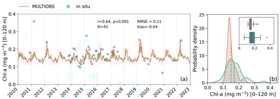 MULTIOBS Chl-a data are publicly available at https://doi.org/10.48670/moi-00046 (accessed on 6 December 2024) distributed by the Copernicus Marine Service. The in situ data supporting the conclusions of this article will be made available by the authors on request.