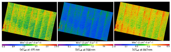 When producing the nLw from Lt, nearly 90% of the signal is removed to compute the Lw. As discussed in the introduction, the red-edge and NIR bands contain striping artifacts in the Lt data. This is evident when inspecting the Lt for each band. In Figure 2, which demonstrates the Lt off the West Florida Shelf it is evident that no striping visibly exists at 491 nm (a), slight striping exists at 708 nm (b), and heavy striping exists at 867 nm (c). This trend is also evident in the data taken near Venice displayed in Figure 3. In the Venice scene, the majority of the striping is seen in the Adriatic Sea, on the right side of the image, while the striping is much less notable in the Venetian Lagoon, toward the left side.