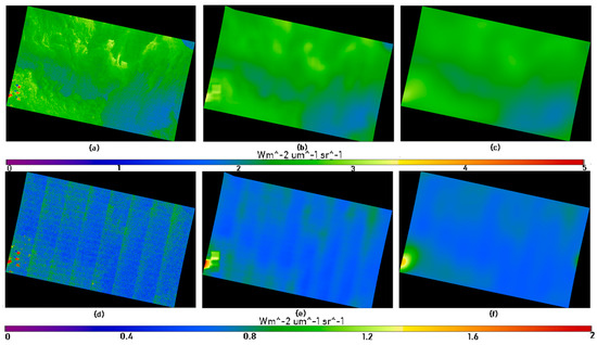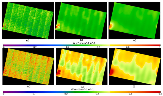 Application of SciPy Uniform filter with kernel size 301 vs. 601 for 5 iterations on the Lt (top) and resulting La (bottom) at 708 nm where (a,d) are the original, striped, images; (b,e) are the 301 × 301 kernel filtered images; and (c,f) are the 601 × 601 kernel filtered images.
