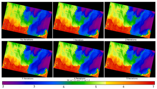The nLw at 491 nm was used to evaluate the performance of the red-edge and NIR smoothing approach for correcting striping artifacts in nLw. This band was selected because, without the application of the smoothing filter, it was found to exhibit no striping in the Lt, but notable striping in the nLw. The results of the application of a filter sized 301 × 301 pixels is examined in Figure 12 for the West Florida Shelf and in Figure 13 for Venice. It is evident in the West Florida Shelf scene that with the 301 × 301 filter applied, the features in the nLw at 491 nm are still very well preserved; however, hints of striping remain evident even at up to five iterations of smoothing. The striping, however, is much less noticeable than it was without any filtering applied. In the Venice scene, smoothing with the 301 × 301 filter removes nearly all of the striping, with a small amount still being detectable near the far-right edge, specifically being the data farthest into the Adriatic Sea. It is also clear that the features of the higher nLw where the inlet to the Adriatic Sea is located once again become visible when the Lt data have been filtered.