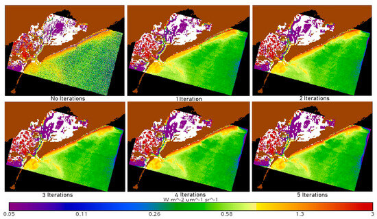 The results of the application of a filter sized 601 × 601 pixels is examined in Figure 14 and Figure 15 for the West Florida Shelf and Venice locations, respectively. In both scenes, striping is diminished more rapidly with the 601 × 601 kernel, leading to negligible striping by four iterations. It is again evident from comparison to the unfiltered data that none of the features in the nLw are lost or changed due to application of the 601 × 601 kernel, with the Venice data even showing an apparent restoration of the previously obscured features toward the final iteration of filtering.
