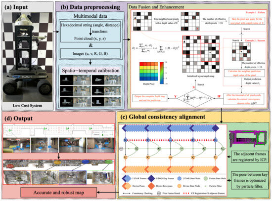 The rapid development of robotics and the Internet of Things has led to the emergence of indoor environment perception and reconstruction as a prominent area of research [1,2], particularly in complex indoor environments where GPS signals are weak or unavailable [3,4]. In such scenarios, there is a need for highly accurate, visually informative three-dimensional (3D) mapping solutions [5]. The majority of mapping technologies currently in use rely on single or limited sensing approaches, including the Velodyne series of LiDAR [6], as well as depth sensors based on stereo vision [7], time-of-flight (ToF) cameras [8], and structured light techniques [9]. While these techniques can provide high-resolution depth measurements, each has its inherent limitations. LiDAR sensors, despite their high accuracy, are often prohibitively expensive [10] and can be affected by adverse weather conditions such as rain or fog. Stereo vision-based depth sensors [7] suffer from poor performance in low-texture environments and are sensitive to lighting conditions. ToF cameras [8] have limited range and can be affected by ambient light interference, while structured light techniques like those used in [9] face challenges in outdoor environments and have restricted working ranges. Additionally, these sensors [11,12,13] often require significant computational resources for data processing, which can impact real-time performance. Moreover, monocular cameras are constrained by their passive sensing nature, which limits their ability to effectively capture depth information. Existing research [14,15,16] indicates that simple pixel-level fusion strategies are insufficient to provide detailed depth information for areas of interest. Furthermore, in the context of post-processing, the iterative closest point (ICP) algorithm [17] and its variants [18,19,20,21,22], despite their widespread use in multi-frame point cloud registration tasks, may encounter local convergence problems, potentially affecting the global consistency of the reconstruction results. Based on these observations, an investigation into cost-effective, accurate and versatile indoor mapping approaches, with a particular focus on low-cost indoor color mapping systems using multi-sensor fusion, is of considerable theoretical importance.