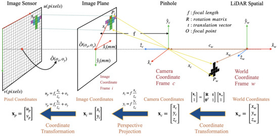 Process of associating 3D point clouds with 2D image pixels. From right to left, (i) rigid body transformation from the world coordinate system to the camera coordinate system, (ii) perspective projection from the camera coordinate system to the image plane, (iii) mapping from the image plane to the pixel coordinate system.