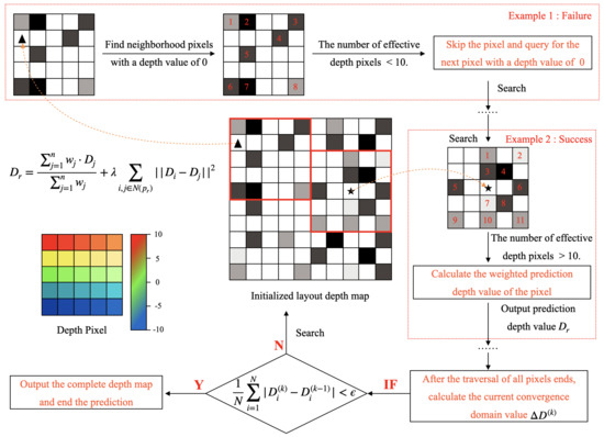 For a better understanding of this algorithm, the process of neighborhood search and depth prediction is shown in Figure 3. If the convergence criterion is met, the algorithm stops and the final depth map D is output. If the convergence criterion is not met, the algorithm iterates until the depth values stabilize. The final output is a refined depth map where missing or ambiguous depth values have been accurately reconstructed through the iterative process.
