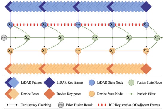 Globally uniform alignment schematic diagram. The main components include key LiDAR frames (in blue), device poses (in orange) and several state nodes corresponding to the sensor fusion results. The system uses particle filtering (green lines) to update the system state and uses ICP (red dashed lines) to perform registration between adjacent frames. The diagram also highlights the fusion process between LiDAR and device observations to achieve global pose alignment.