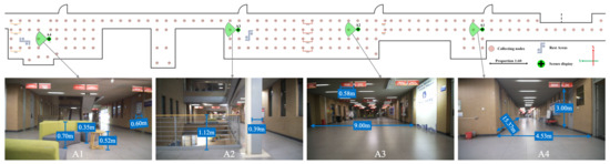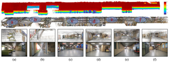 Figure 10 shows the reconstruction results of the large-scale, globally consistent 3D colored indoor map. The figure is divided into three sections: (i) the top section shows the uncolored 3D point cloud map, (ii) the middle section shows the complete colored point cloud map, (iii) the bottom section shows detailed views of various acquisition nodes, which are compared with corresponding photographs of the real scene to assess the reconstruction quality.