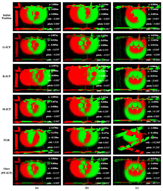 In Figure 9a, the initial transformation consists solely of translation along the x-axis without any rotation. In this scenario, the proposed PF-ICP achieves the most accurate point cloud alignment, with minimal misalignment observed between the red (target) and green (source) point clouds. In contrast, although G-ICP and R-ICP also yield good overall alignment, slight discrepancies are present along the wall edges. M-ICP demonstrates slightly inferior performance, particularly in the edge regions where registration errors are apparent. The FGR method, however, performs poorly in this scenario, with substantial separation between the point clouds, especially along the left side of the wall, indicating its inability to achieve effective registration under conditions involving pure translation.
