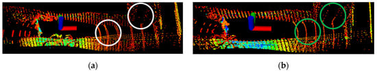 By comparing the places marked by white circles in Figure 3a and the places marked by green circles in Figure 3b, it can be found that the LiDAR point cloud after de-distortion realizes the point cloud coordinate correction, and the coordinate points of the start moment and the end moment of each frame of the LiDAR point cloud are under the same coordinate system.