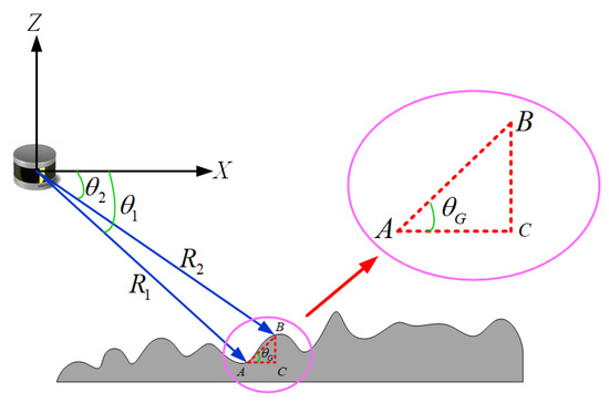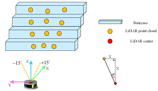 The vertical angular resolution of the LiDAR ranges from to , with laser beams numbered from to in ascending order from bottom to top. Only the beams below the horizontal line effectively project onto the stair step surfaces, so the point cloud data from beams numbered to are selected for ground segmentation. Let the emission angles of two adjacent laser beams be and , respectively, with ground points A and B located on the stair step surfaces at distances and from the LiDAR center. The ground angle can then be defined as shown in Equation (9).