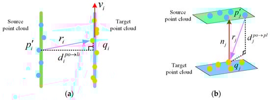 The point-line distance and the point-plane distance can be calculated using Equations (10) and (11).