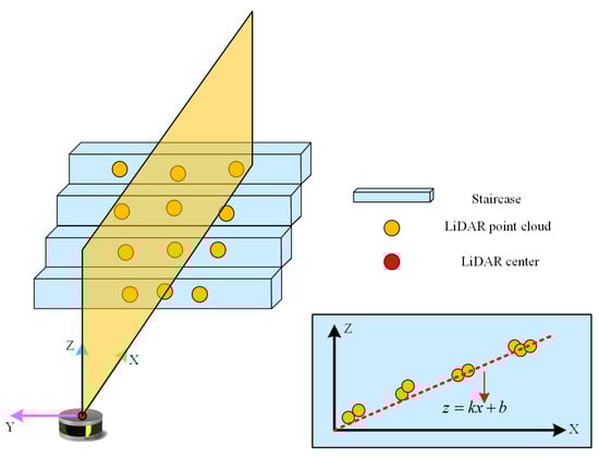 LiDAR-based dimensional inspection for staircase-oriented scenes first requires extraction of the staircase point cloud from the LiDAR point cloud. First, a threshold is set for the horizontal angle of the LiDAR point cloud, and the points within this threshold range are identified as part of the region of interest. Next, the point cloud in the region of interest is projected onto the -axis in the LiDAR coordinate system. -plane fitting is then performed on the projected point cloud, with the Ceres optimizer used to solve the linear fitting parameters in the -plane. If the fitting parameters meet the threshold criteria, the point cloud in the region of interest is classified as a staircase point cloud.