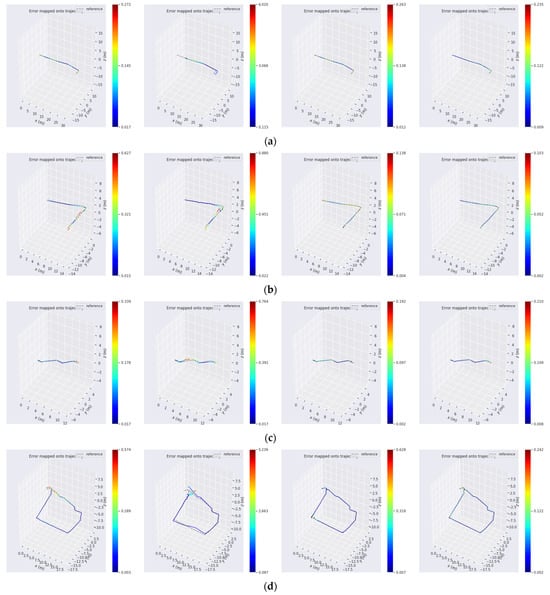 The precision of the algorithms is qualitatively analyzed by comparing the errors between the trajectories fitted by these four algorithms and the ground truth on respec-tively the four datasets in Figure 16a–d. A perusal of the trajectories fitted by each algo-rithm and the zoomed-in details of the trajectories reveals that in terms of the overlap be-tween the fitted trajectories and the ground truth, the trajectories fitted by the proposed al-gorithms in this paper have the highest overlap with the ground truth, while the trajecto-ries fitted by LeGO-LOAM have the lowest overlap, and those fitted by A-LOAM and LIO-SAM have the overlap in the middle.
