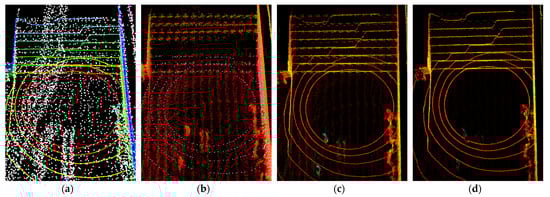 Figure 19 and Figure 20 show the mapping results of the A-LOAM algorithm, LeGO-LOAM algorithm, LIO-SAM algorithm, and the algorithm proposed in this paper on the two recorded datasets in turn, and it can be concluded that our proposed algorithm has the best mapping results in the staircase scenario by comparing all the mapping results, and the results of the mapping results are shown in Figure 19d and Figure 20d. The point cloud color difference is mainly due to the different algorithms based on OpenGL point cloud rendering method is not the same caused by the white point cloud in Figure 19a and Figure 20a are the real-time point cloud data acquired by LiDAR (some of the noise and outliers are included in the construction results), the color point cloud is the result of the construction of the A-LOAM algorithm. The above four algorithms all carry out point cloud motion compensation and degradation detection processing, the main reason why our method builds the best map results is that we remove the outlying anomalies by Statistical Outlier Removal algorithm, extract the plane features after effective segmentation of the ground point cloud, and reduce the influence of noise and uncertainty on the matching of the point cloud.