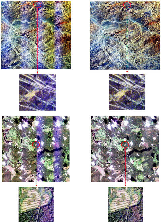 In recent years, deep learning-based methods have been increasingly applied to remote sensing imagery processing tasks, such as denoising [30,31,32,33], super-resolution [34,35,36,37], and destriping [38,39,40,41,42,43], due to their powerful learning capabilities. These deep learning-based destriping algorithms perform well in removing high-frequency stripe noise but are less effective in addressing color distortion. This is mainly due to the way training datasets are constructed. In remote sensing imagery, it is challenging to obtain both images with real stripe noise and their corresponding clean images. As a result, the stripes need to be simulated. A common approach is to add zero-mean Gaussian white noise to each column of the clean image, band by band, to generate corresponding images with stripe noise [39,40,41]. While this method can effectively simulate high-frequency stripe noise, it fails to simulate color distortion. Consequently, models trained on such datasets are unable to solve color distortion.